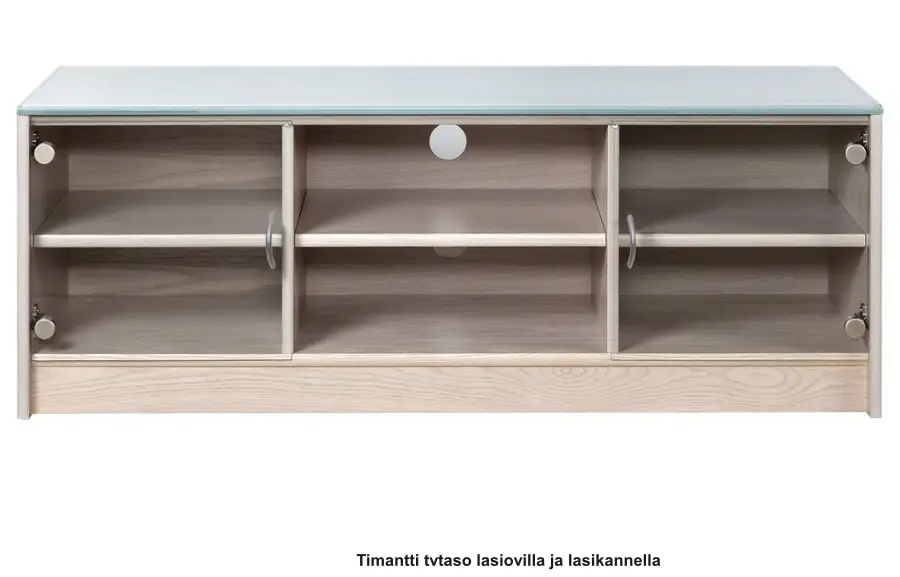 TV-taso on jaettu kolmeen osioon, joista jokaisessa on oma hylly, tarjoten runsaasti tilaa elektroniikalle ja säilytykselle. Ovet ovat valittavissa umpiovina tai vaihtoehtoisesti lasi- tai rimaovilla, ja lisäksi voit räätälöidä kalusteen värit siten, että runko ja kansi ovat samaa tai eri sävyä – myös tyylikäs lasikansi on saatavilla.
