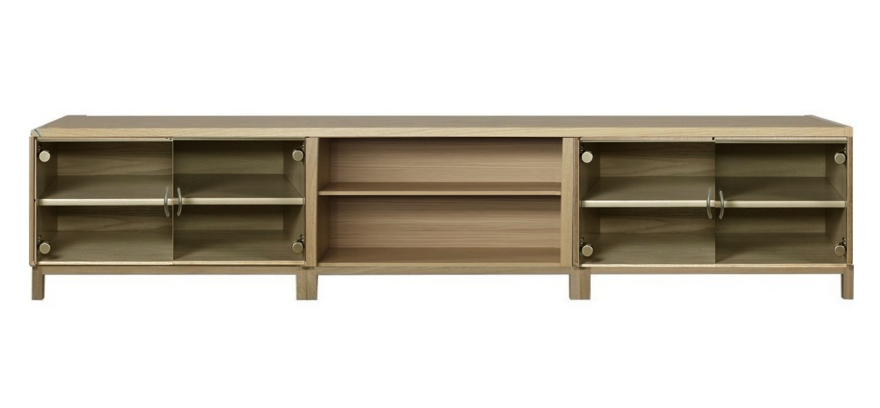Tasossa on keskellä avohylly ja reunalla kaapit kehyksettömillä lasiovilla. Kokonaisuus on suunniteltu helposti räätälöitäväksi; voit valita senkin yhdellä värillä tai yhdistellä rungon, kannen ja oven eri sävyissä sekä halutessasi vaihtaa oven mallin sisustusta korostavaksi vaihtoehdoksi. Näin kaluste mukautuu elämäntilanteen ja tarpeiden muuttuessa.