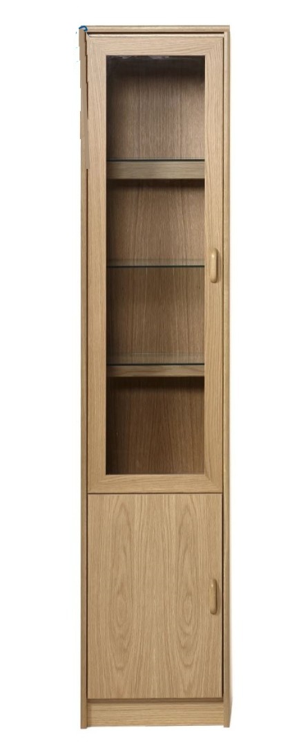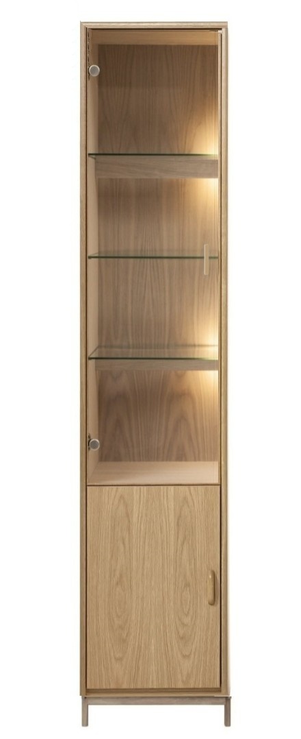 Vitriinissä on alla käytännöllinen kaappi umpiovella ja päällä vitriinikaappi hyllyllä ja lasikehysovet. Kokonaisuus on suunniteltu helposti räätälöitäväksi; voit valita vitriinin yhdellä värillä tai yhdistellä rungon, kannen ja oven eri sävyissä sekä halutessasi vaihtaa oven mallin sisustusta korostavaksi vaihtoehdoksi. Näin kaluste mukautuu elämäntilanteen ja tarpeiden muuttuessa.