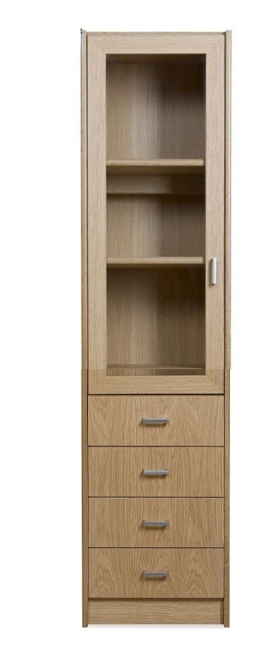 Vitriinissä on alla käytännöllinen laatikosta ja päällä vitriinikaappi hyllyllä ja lasikehysovet. Kokonaisuus on suunniteltu helposti räätälöitäväksi; voit valita vitriinin yhdellä värillä tai yhdistellä rungon, kannen ja oven eri sävyissä sekä halutessasi vaihtaa oven mallin sisustusta korostavaksi vaihtoehdoksi. Näin kaluste mukautuu elämäntilanteen ja tarpeiden muuttuessa.