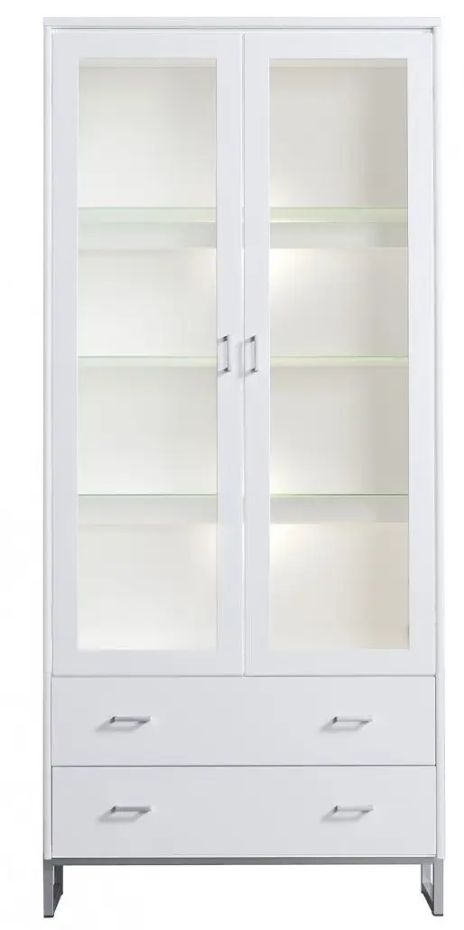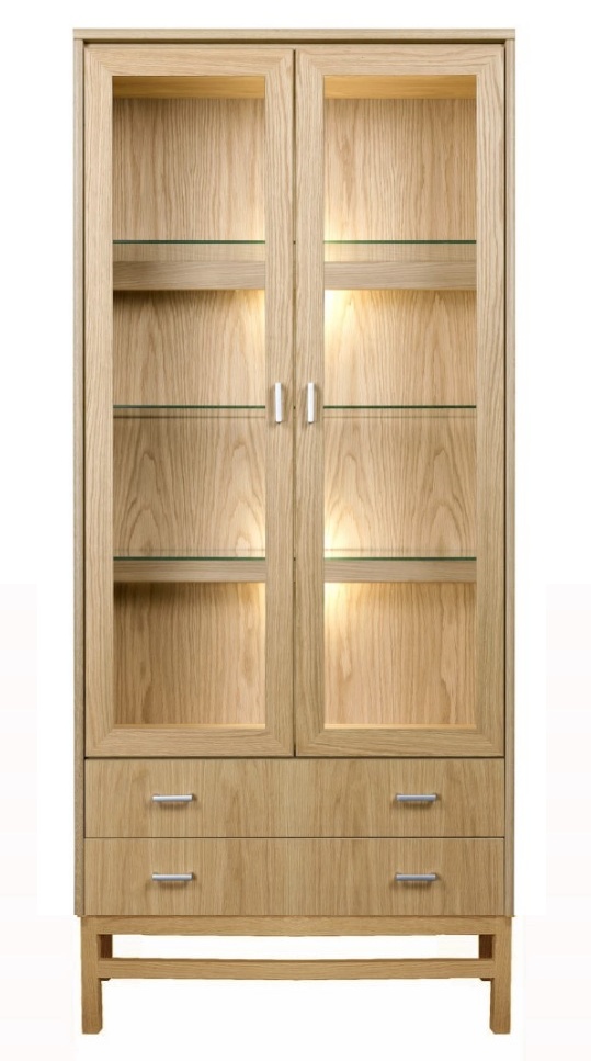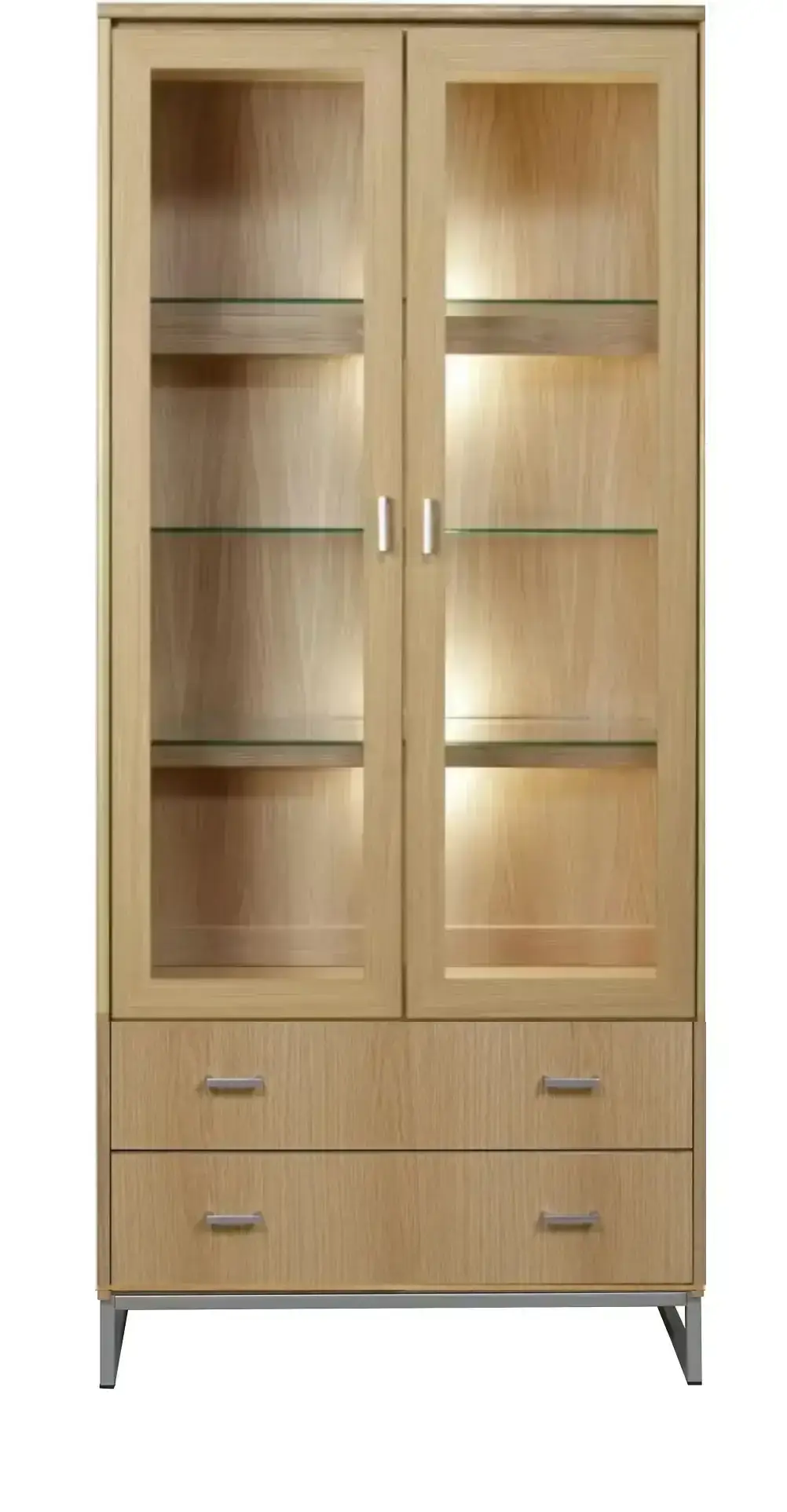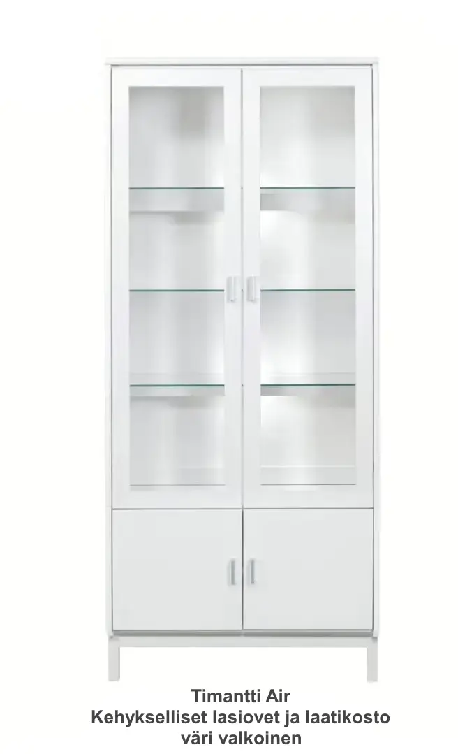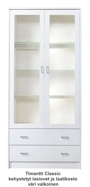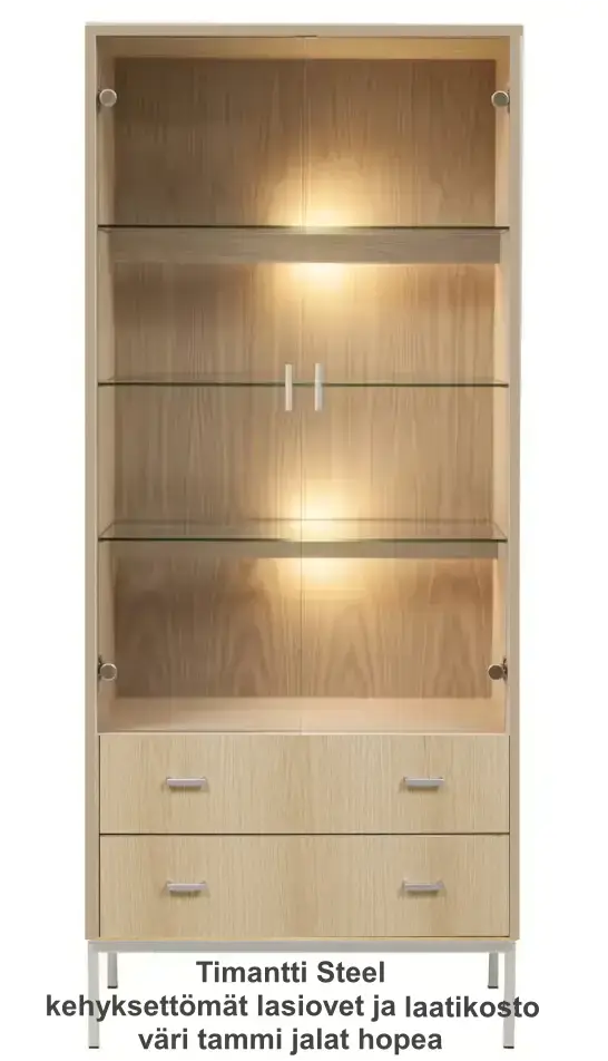 Vitriinissä on alla käytännöllinen laatikosto 2 laatikolla ja päällä vitriini kolmella lasihyllyllä. Vitriinin 2 lasihyllyn takana on led kynttilälamput ja valolista ja vitriinissä on lasikehysovet. Kokonaisuus on suunniteltu helposti räätälöitäväksi; voit valita vitriinin yhdellä värillä tai yhdistellä rungon, kannen ja oven eri sävyissä sekä halutessasi vaihtaa oven mallin sisustusta korostavaksi vaihtoehdoksi. Näin kaluste mukautuu elämäntilanteen ja tarpeiden muuttuessa.