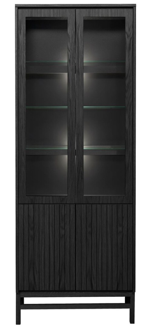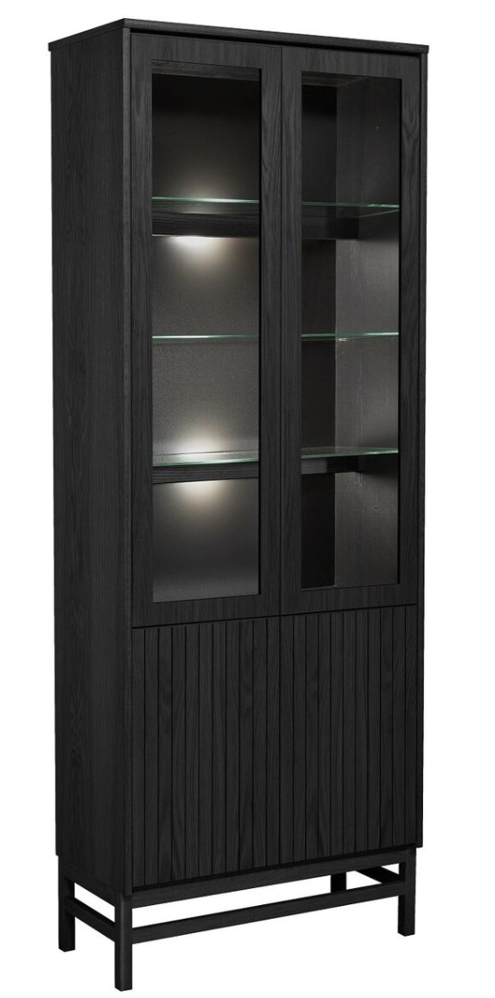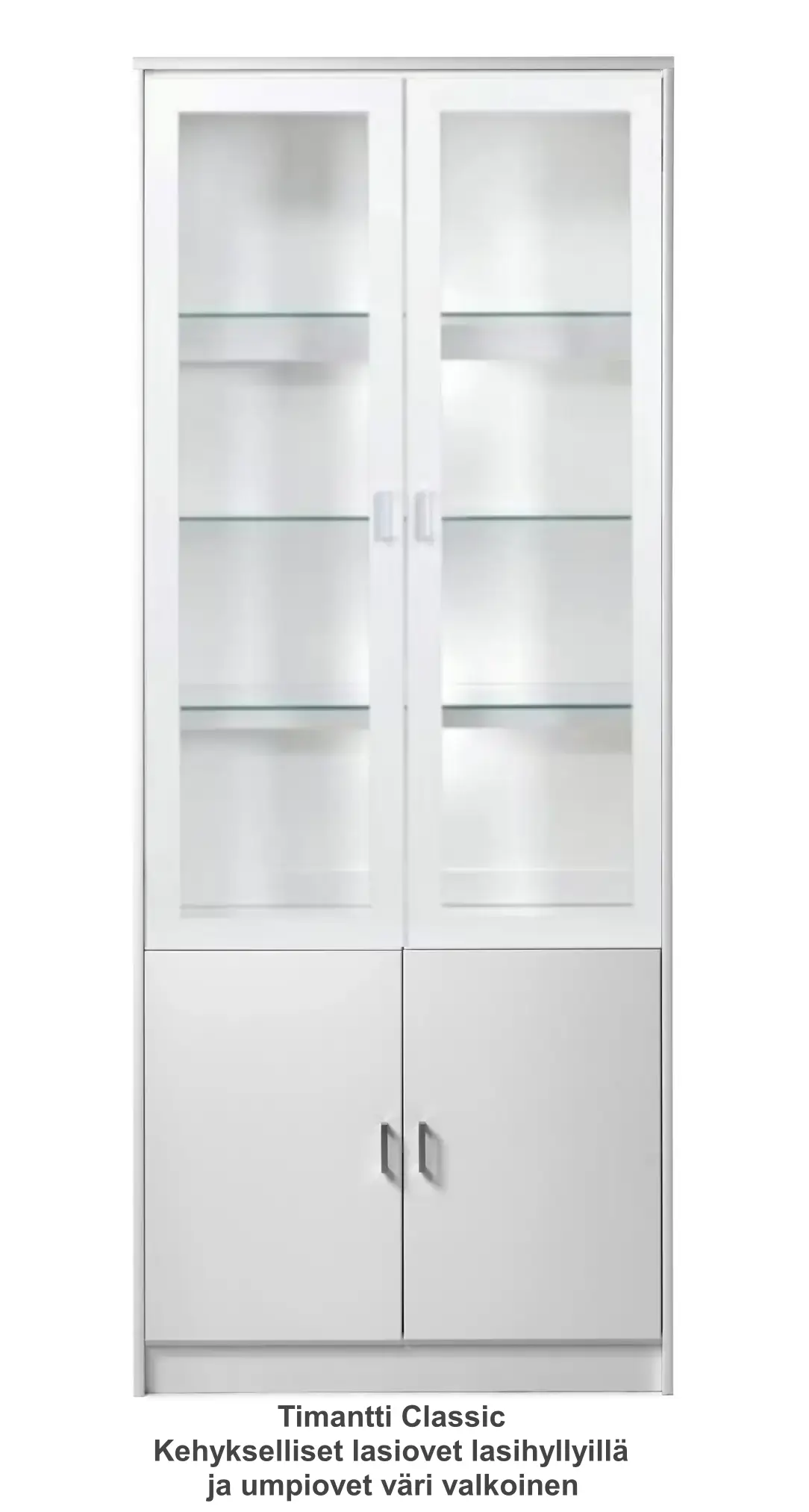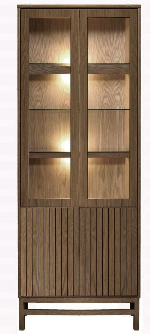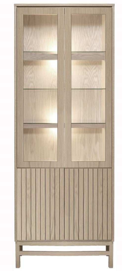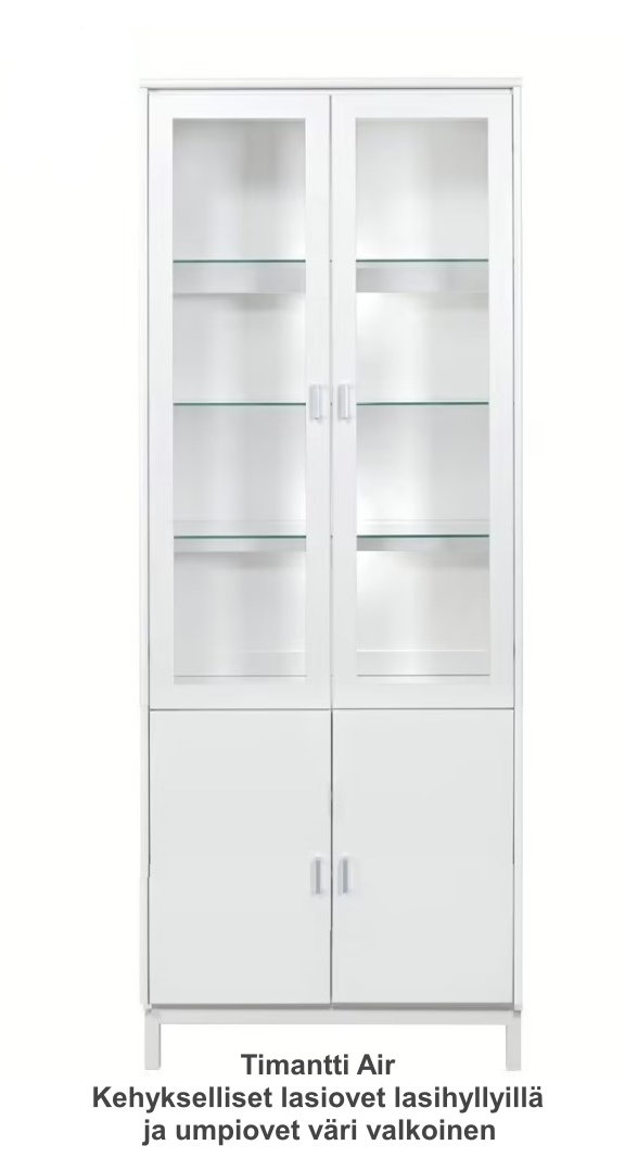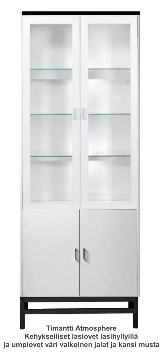 Vitriinissä on alla käytännöllinen kaappi umpiovilla ja hyllyllä ja päällä vitriini kolmella lasihyllyllä.  Vitriinin 2 lasihyllyn takana on led kynttilälamput ja valolista ja vitriinissä on lasikehysovet. Kokonaisuus on suunniteltu helposti räätälöitäväksi; voit valita vitriinin yhdellä värillä tai yhdistellä rungon, kannen ja oven eri sävyissä sekä halutessasi vaihtaa oven mallin sisustusta korostavaksi vaihtoehdoksi. Näin kaluste mukautuu elämäntilanteen ja tarpeiden muuttuessa.