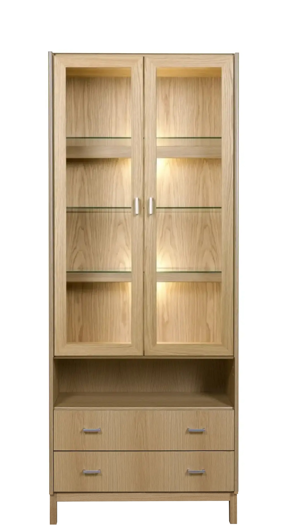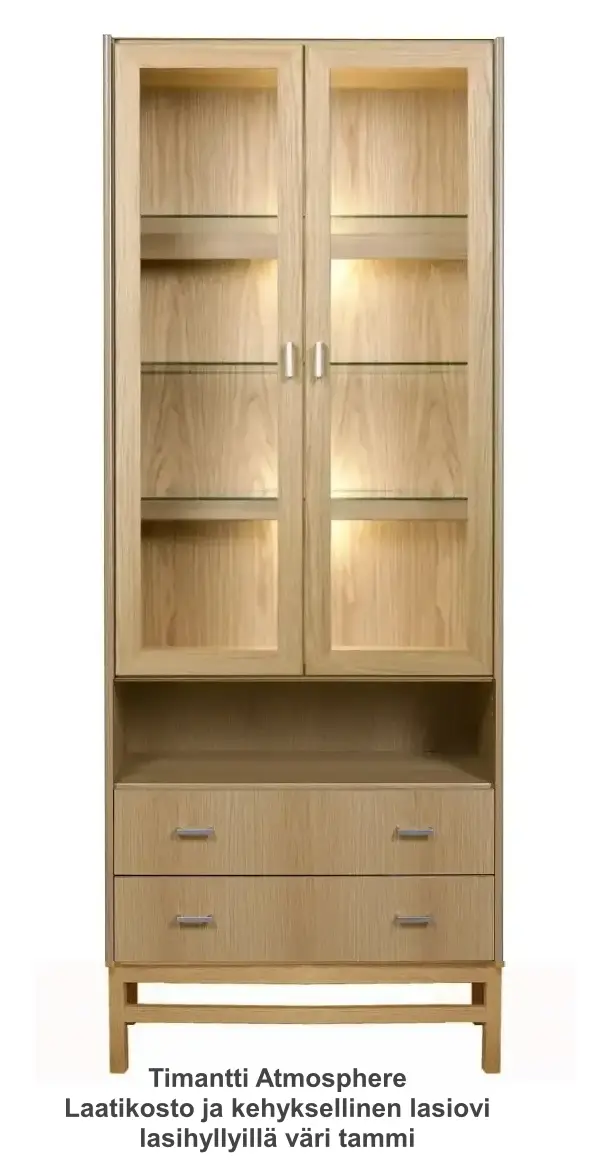 Vitriinissä on alla käytännöllinen laatikosto 2 laatikolla ja päällä vitriini kolmella lasihyllyllä. Vitriinin 2 lasihyllyn takana on led kynttilälamput ja valolista ja vitriinissä on lasikehysovet. Kokonaisuus on suunniteltu helposti räätälöitäväksi; voit valita vitriinin yhdellä värillä tai yhdistellä rungon, kannen ja oven eri sävyissä sekä halutessasi vaihtaa oven mallin sisustusta korostavaksi vaihtoehdoksi. Näin kaluste mukautuu elämäntilanteen ja tarpeiden muuttuessa.