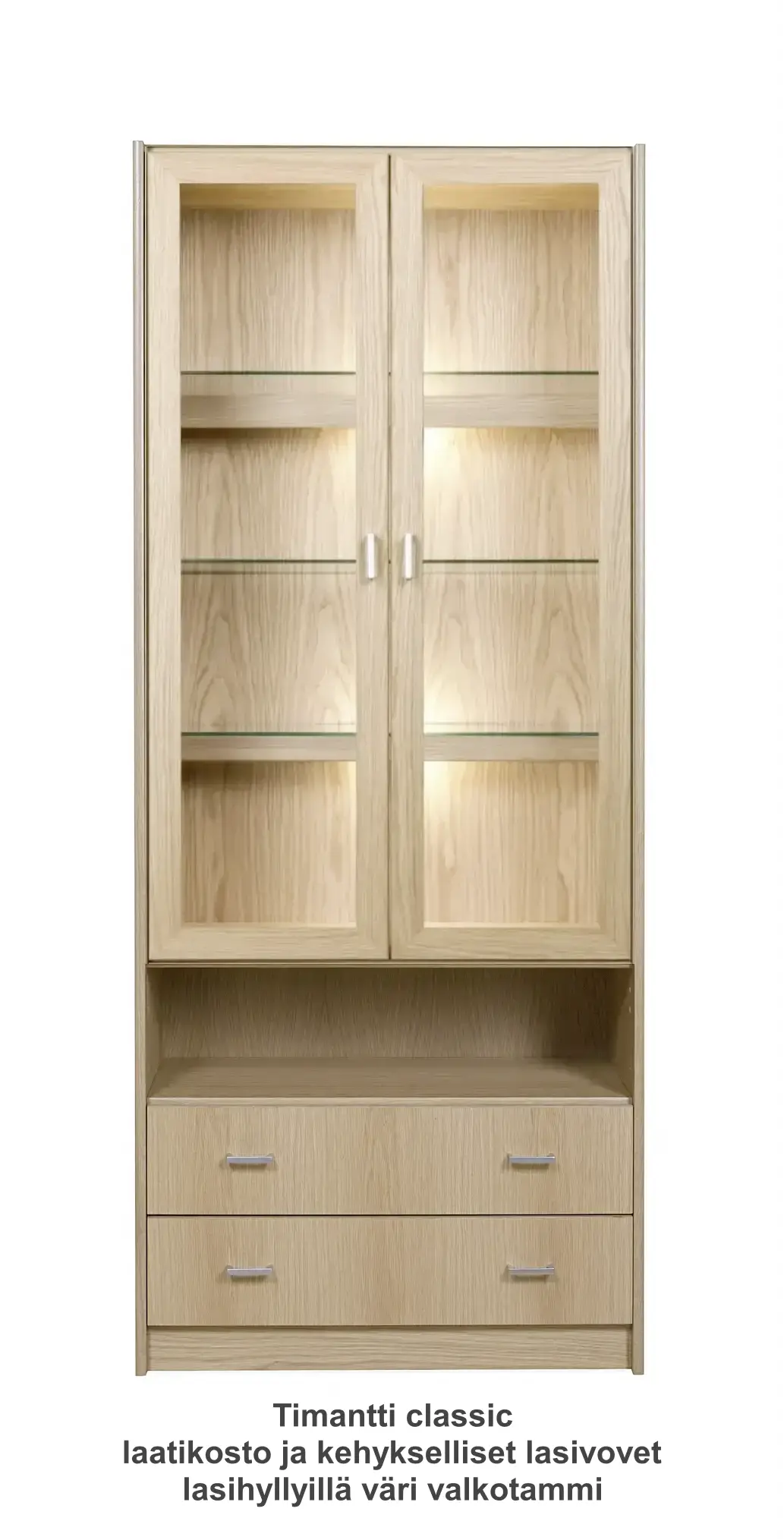 Timantti Vitriini on osa kotimaista Timantti-kalustesarjaa ja edustaa selkeää skandinaavista muotoilua, jossa yhdistyvät harmoninen ulkonäkö ja kestävä estetiikka. Sen rauhallinen ja ajaton ilme sopii vaivattomasti olohuoneeseen, ruokailutilaan tai eteiseen sekä täydentää monenlaisia sisustustyylejä. Vitriinistä on saatavana neljä eri mallia: Timantti Classic sokkelilla, Timantti Air ja Timantti Atmosphere korkeilla puujaloilla sekä Timantti Steel metallijaloilla mustana tai hopeana, mikä mahdollistaa juuri oikean ilmeen valinnan.