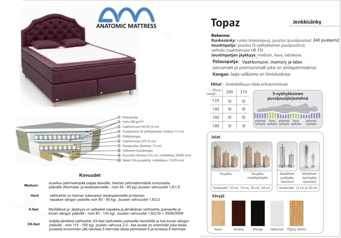 Topaz-jenkkisänky tarjoaa neljä kovuusvaihtoehtoa – medium, hard, X hard ja XX hard – ja voit viimeistellä mukavuuden kolmella erilaisella sijauspatjalla: vaahtomuovi-, memory- tai latex-mallilla. Jokaisesta vaihtoehdosta löytyy perus- ja premium-versio, ja kaikissa on irrotettava, vesipestävä päällinen. Useat verhoiluvaihtoehdot ja lisävarusteet, kuten sängynpääty ja päätypenkki, tekevät kokonaisuudesta tyylikkään ja yksilöllisen.