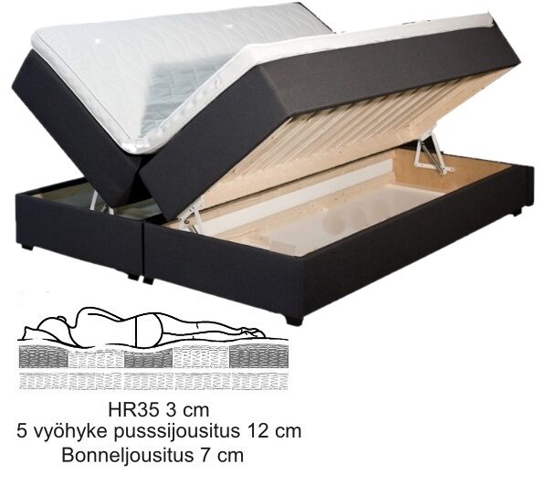 | 140 cm | 200 cm | 55 cm | cm | cm | cm | cm | cm | cm | cm | cm | cm | cm | cm | cm | cm | cm | cm | cm | cm | cm | cm | cm | cm | cm | cm | cm | 140x200 cm - sisältää kaksi 70x200 cm patjaa | Runkopatjan korkeus on ilmoitettu ilman jalkoja ja sijauspatjaa | Medium, Kova, Extra kova | cm | Alajousitus Bonneljousitus korkeus 7 cm, Jalat muovia, Keskellä strech kangas, Päällä vaahtomuovi HR35 3 cm, Runko massiivipuuta, Reunalla vaahtomuovi E25 7 cm, Säilytyslaatikko Mfd, korkeus 25 cm, Sälepohja puuta, Valinnainen verhoilukangas, Vanu 80g/m2, Yläjousitus 5 vyöhykkeinen pussijousitus 12 cm | Ace Kangas, Monolith kangas, Perfect Harmony kangas, Storm kangas | Musta | cm | Täystakuu tuotteelle 2 vuotta | Tilaustuote | 70 kg | Viro | cm | cm | cm |