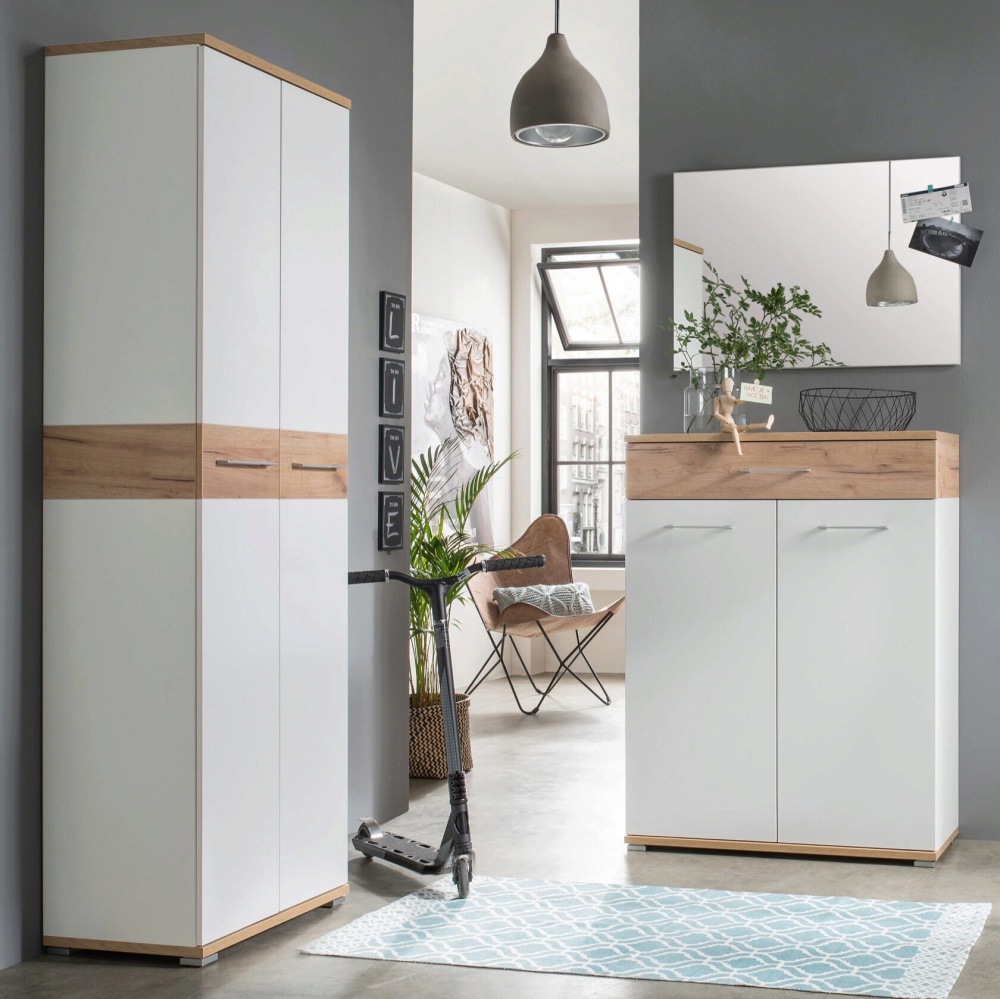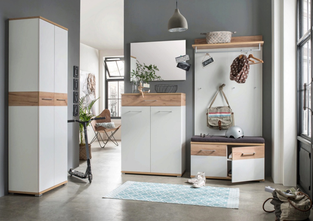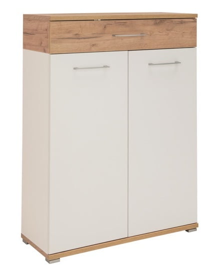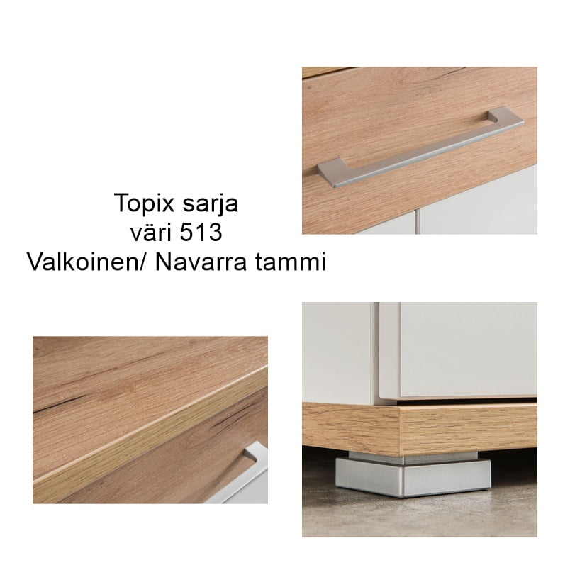 Valkoisen ja Navarra tammen tyylikäs yhdistelmä tuo eteiseen modernia ilmettä, joka sopii monenlaiseen sisustukseen. Hartsipintainen kalustelevy varmistaa kaapin pitkäikäisyyden ja helppohoitoisuuden, tehden siitä luotettavan valinnan vilkkaaseenkin käyttöön.
