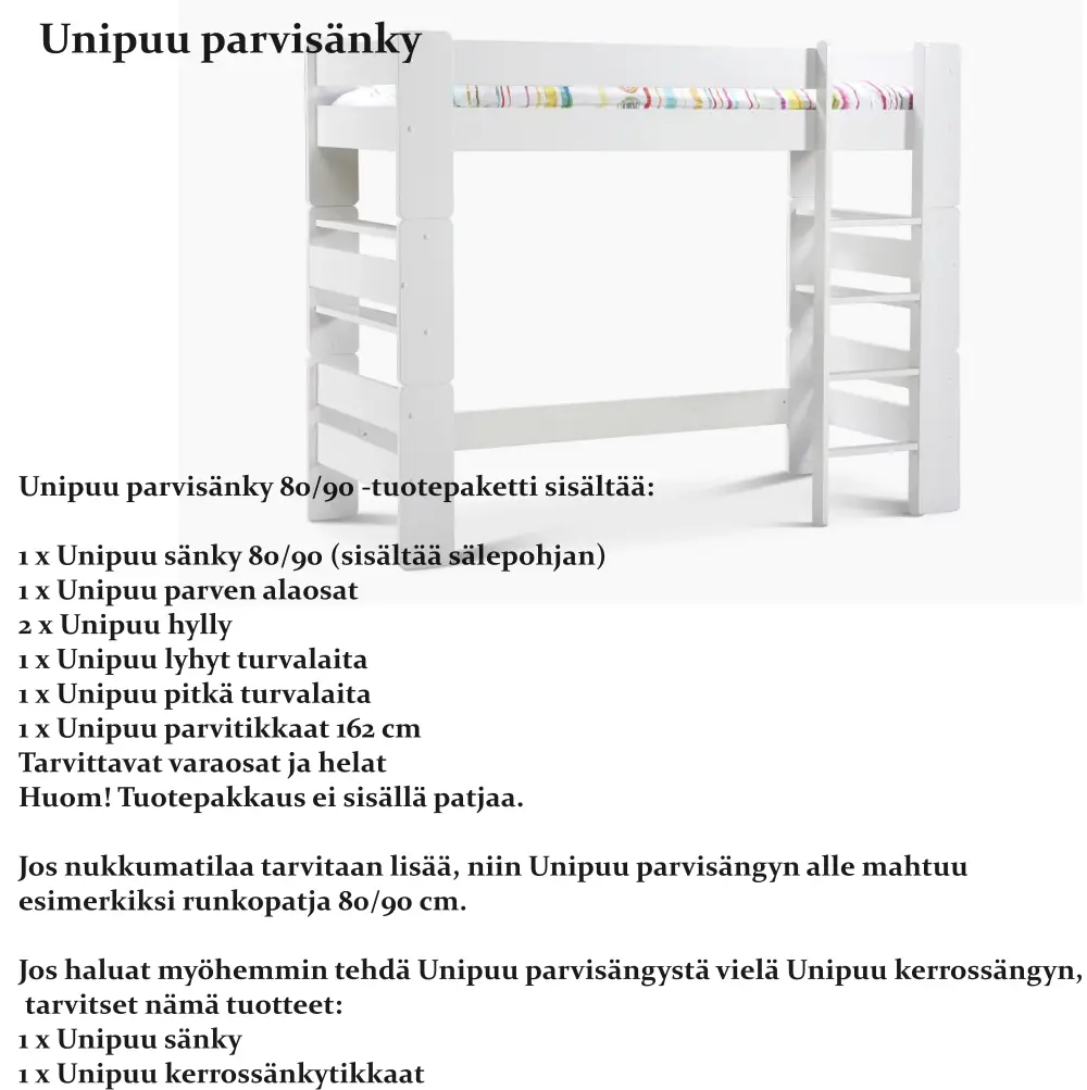 erilaisia lisäosia, joiden ansiosta sänkyä voi muuntaa vaikkapa parveksi tai kerrossängyksi. Lisäksi saatavana on myös esimerkiksi turvalaitoja, tikkaita, hyllyjä, laatikoita sekä varavuode. Unipuu sängystä on hyvä aloittaa, sillä sängyn voi myöhemmin muuntaa parveksi tai kerrossängyksi hankkimalla lisäosia tarpeen mukaan. Unipuu sänky sisältää sälepohjan.