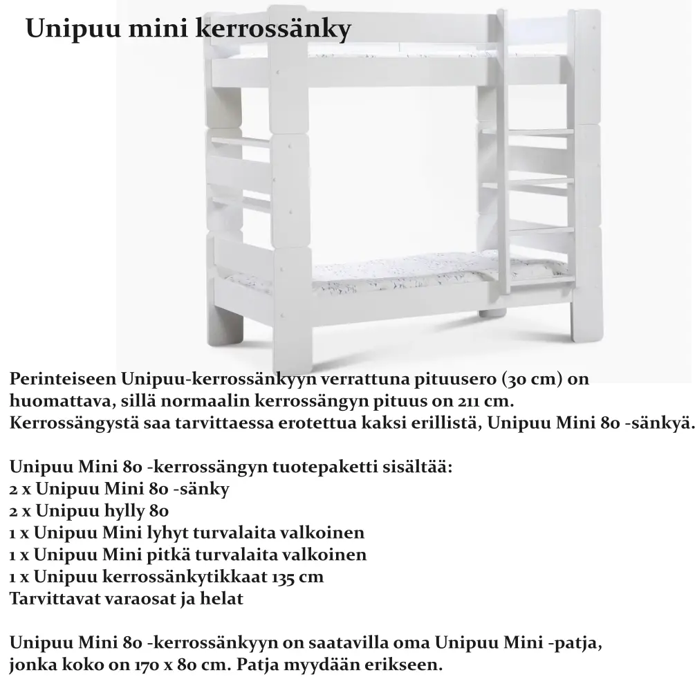 Niemen Tehtaiden Unipuu sarja on tukeva sekä turvallinen ja se on suunniteltu erityisesti lapsille sekä nuorille. Tuotteet ovat tehty laadukkaista materiaaleista sekä suomalaiseen sisustukseen sopivaksi. Sänkyä on saatavana 2 eri leveydellä ja voit myäs tilata sänkyyn patjat ja varavuoteen