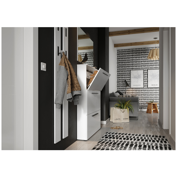 Huolellisesti viimeistellyt materiaalit ja laadukas kalustelevy takaavat kenkäkaapin pitkäikäisyyden ja kestävyyden. Jokainen yksityiskohta on suunniteltu kestämään arjen kulutusta ja säilyttämään tyylikkään ulkonäkönsä pitkään.