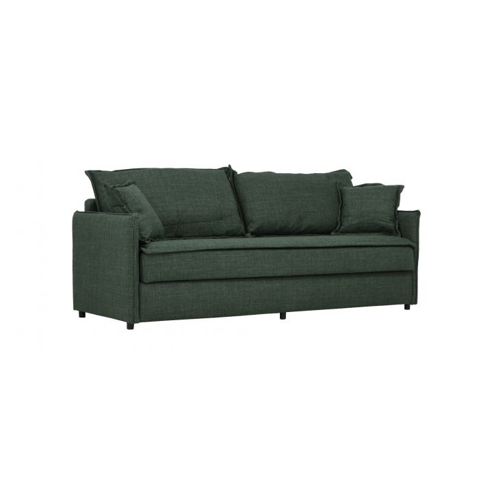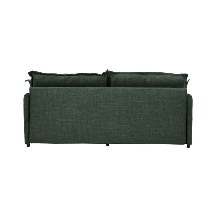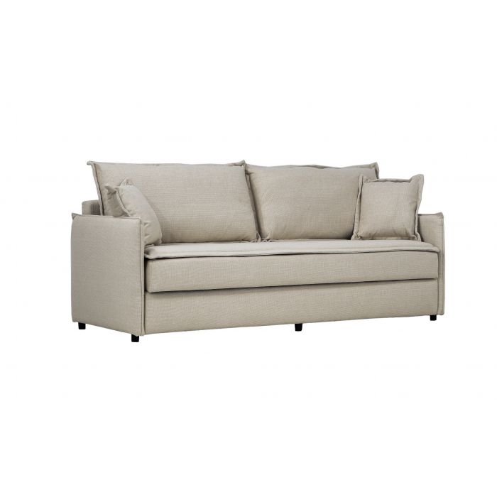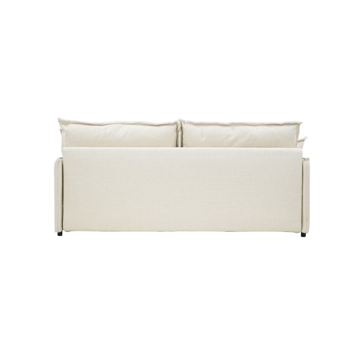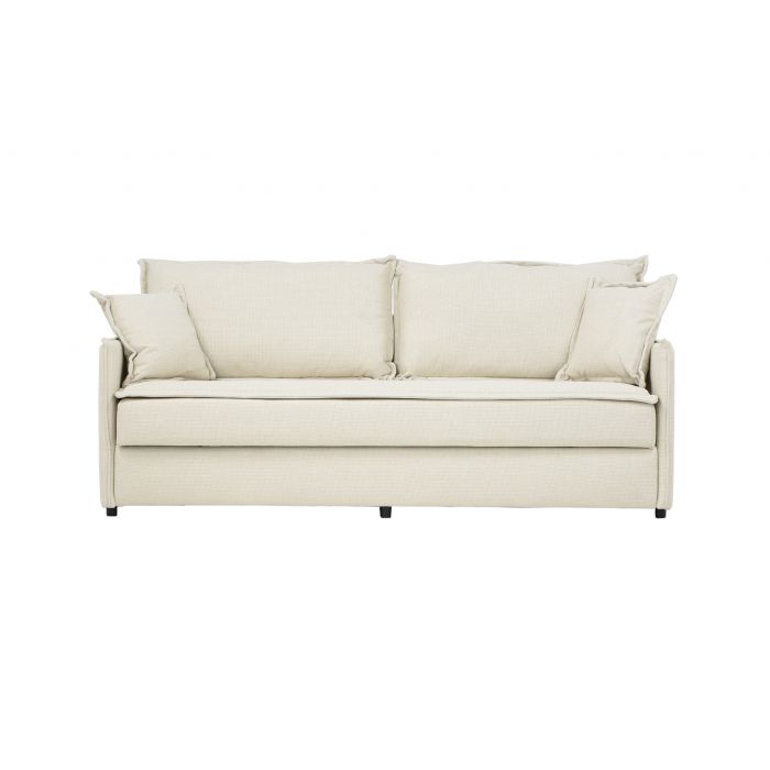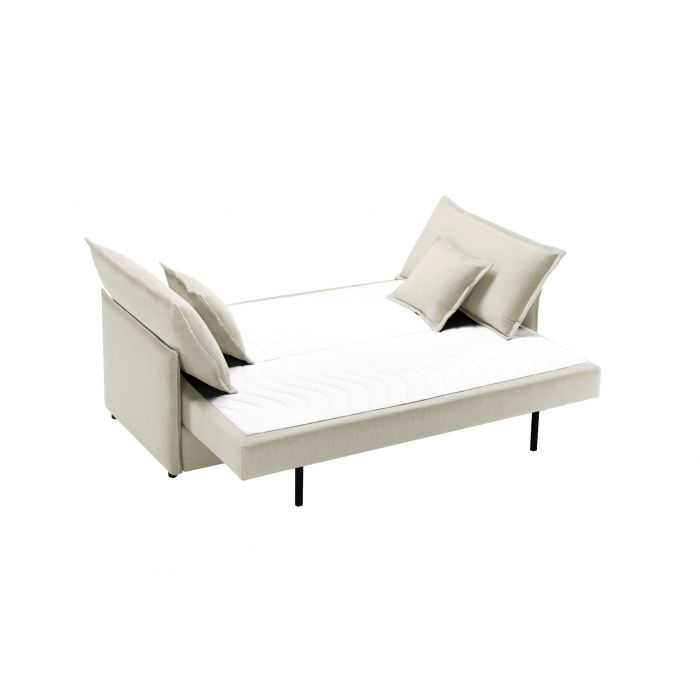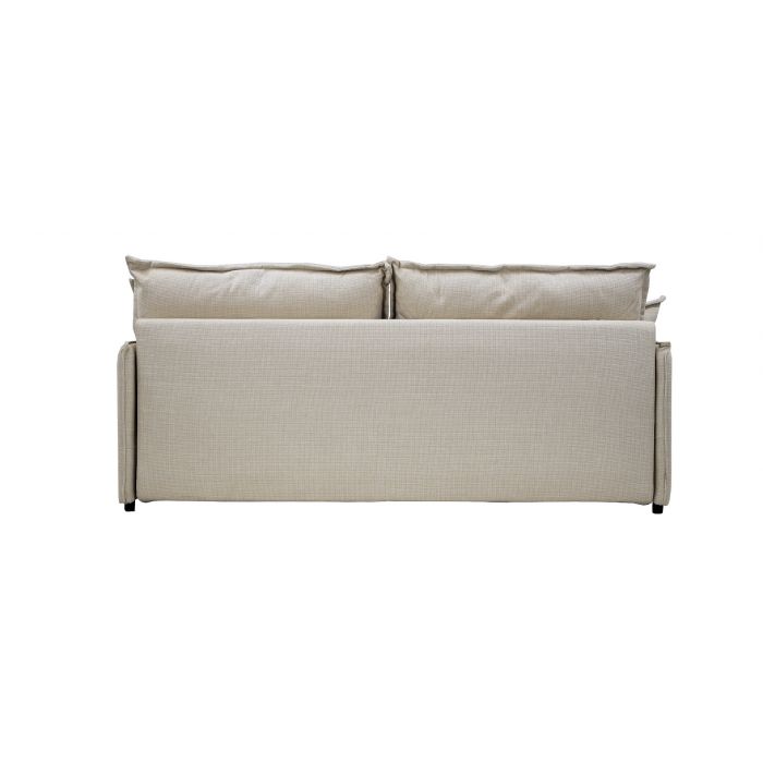 Vuodemekanismi muuntaa sohvan nopeasti 190 × 140 cm kokoiseksi vierasvuoteeksi, ja integroitu kiinteä petauspatja lisää nukkumismukavuutta. Istuinosan pussijousitus sekä tiivis ja kestävä HD-vaahtomuovi (30 kg/m³) takaavat napakan mutta miellyttävän istuttavuuden ja pitkäikäisen käyttökokemuksen. Selkä- ja koristetyynyjen kuituvanupäällyste tuo pehmeyttä ja tukea rentoutumiseen.