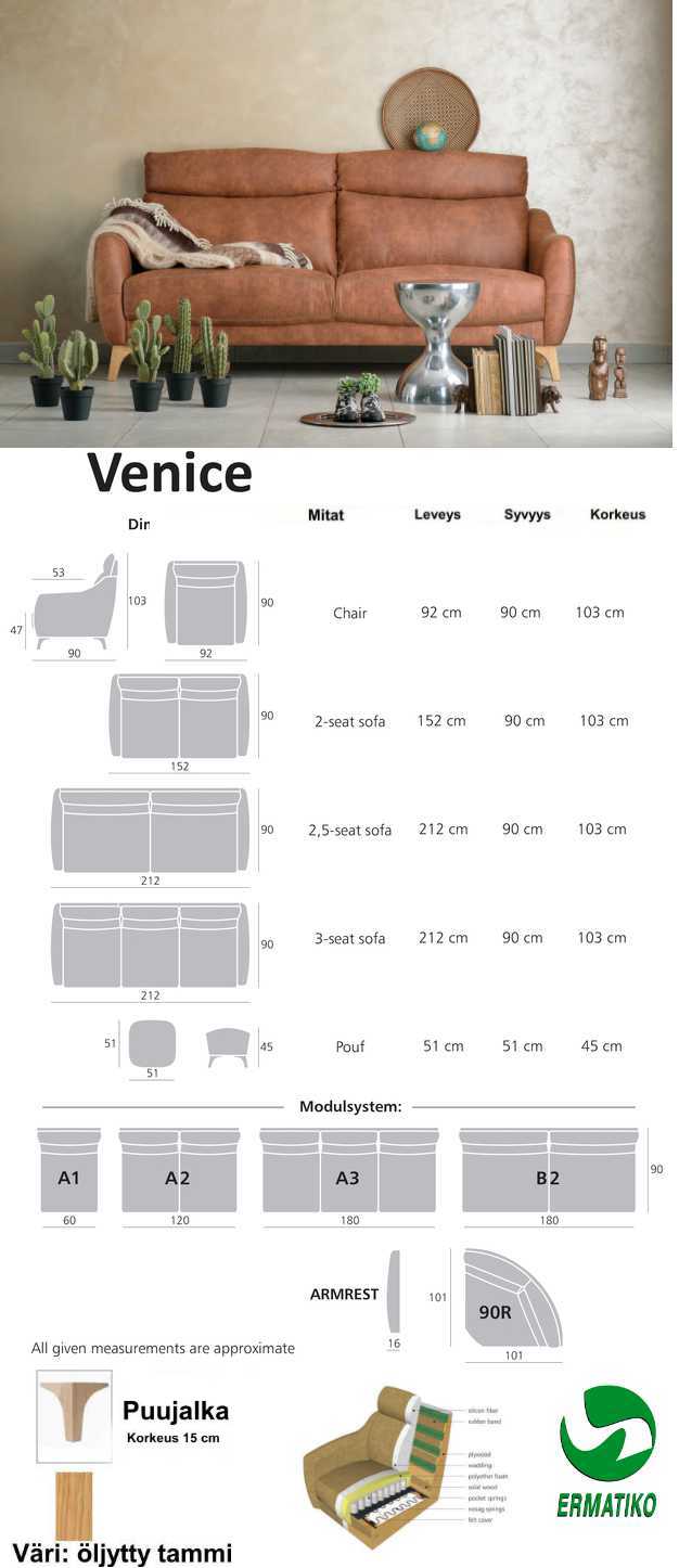 Venice 2 ist sohva tarjoaa ylellisen pussijousitetun istuinmukavuuden ja elegantin tikkauksilla viimeistellyn muotoilun, joka sopii täydellisesti niin moderniin kuin klassiseenkin sisustukseen. Kestävä runko ja laadukkaat verhoiluvaihtoehdot, kuten aidot nahat, tekevät siitä pitkäikäisen ja näyttävän valinnan kotiisi.