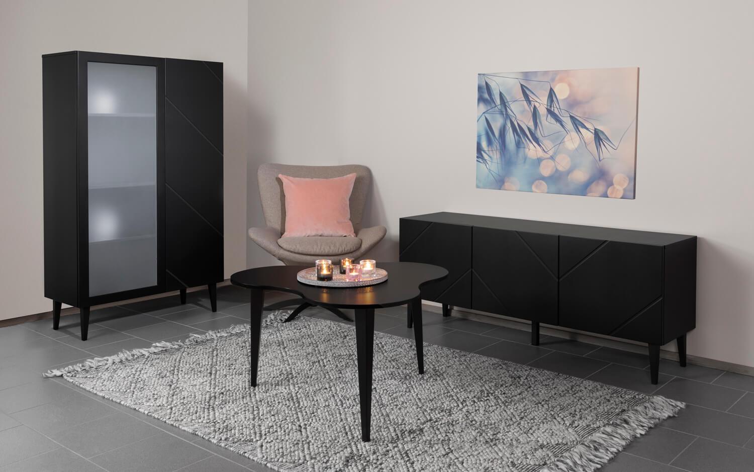 Maalattu MFC-runko, MDF-kansi ja etusarjat sekä massiivipuiset jalat takaavat rakenteen pitkäikäisyyden ja laadun. Senkki on saatavilla kolmessa trendikkäässä struktuurimaalatussa sävyssä – musta, kaura, kaakao,oliviin ja valkoinen – jotka sopivat monenlaisiin sisustustyyleihin. Tuote voidaan myös tilata kaksivärisenä esim siten että kansi on eri värinen samoin voit valita jalkojen värin. Kunkin kaapin kahden korkeussäädettävän hyllyn ansiosta säilytystila on helposti muokattavissa omien tarpeiden mukaan, mikä tekee kaapista käytännöllisen ratkaisun erilaisiin tiloihin.