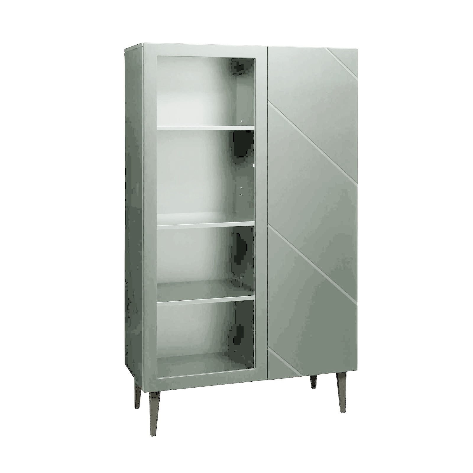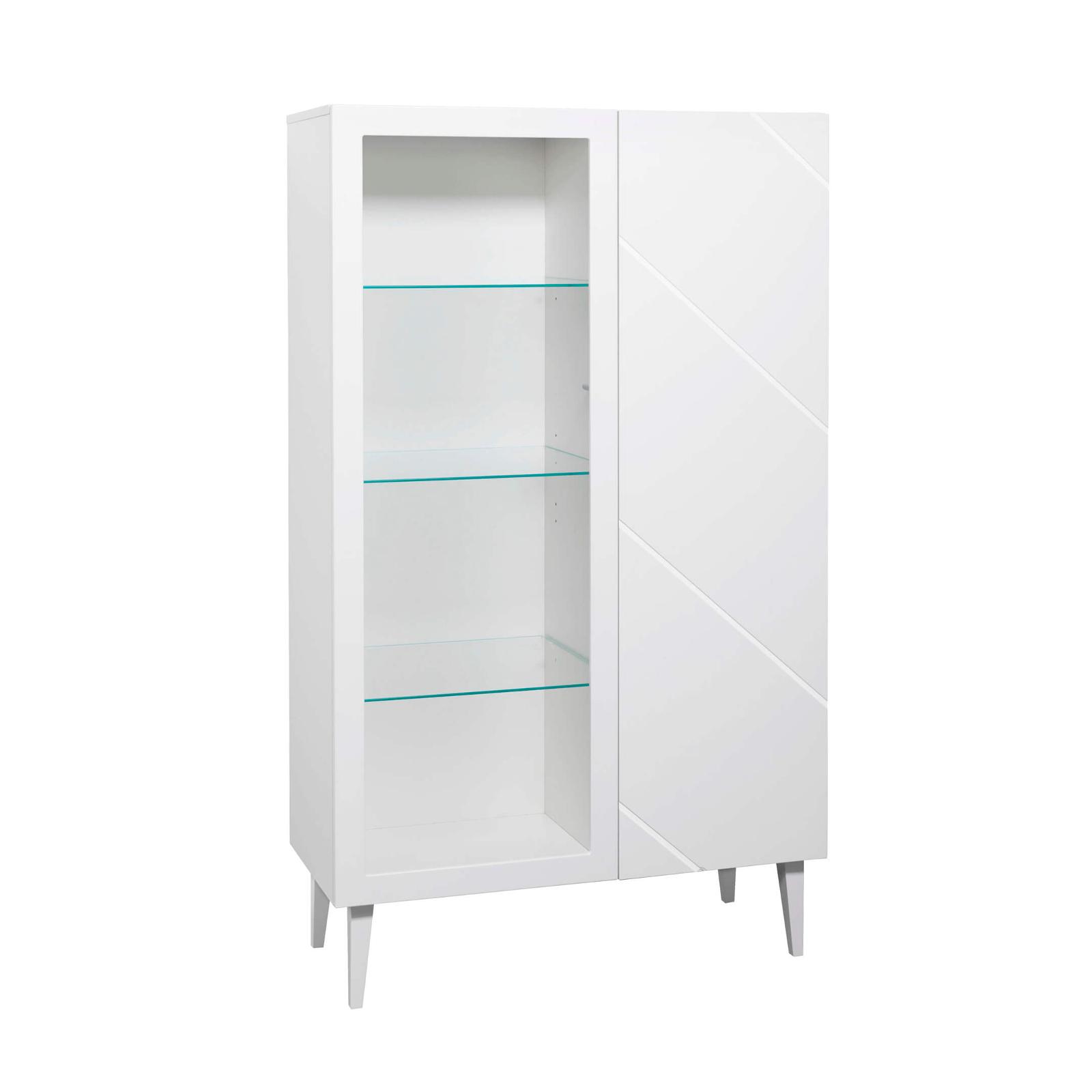 Kaapin kätisyys on valittavissa – kirkas lasiovi voidaan sijoittaa joko oikealle tai vasemmalle, ja kolme korkeussäädettävää hyllyä tarjoavat joustavan säilytystilan erilaisille esineille. Vitriini soveltuu yhtä hyvin arkiastioille kuin koriste-esineillekin.