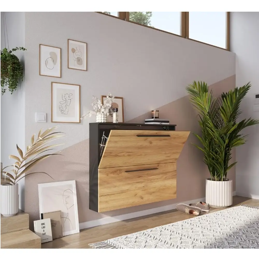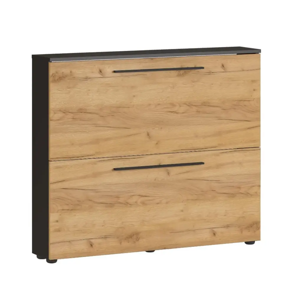 Wildomar kenkäkaappi 3883 tarjoaa tyylikkään ja kompaktin säilytysratkaisun eteiseen, yhdistäen grafiitin ja tammen sävyt moderniksi kokonaisuudeksi. Sen selkeälinjainen ulkonäkö ja huolitellut metallivetimet tuovat kotiin raikkaan, viimeistellyn ilmeen ilman ylimääräistä tilantarvetta.