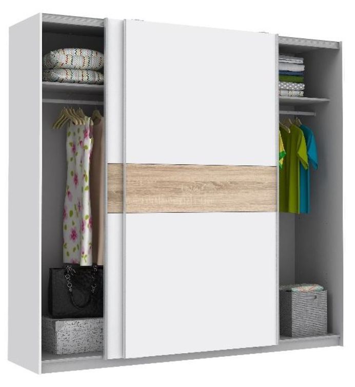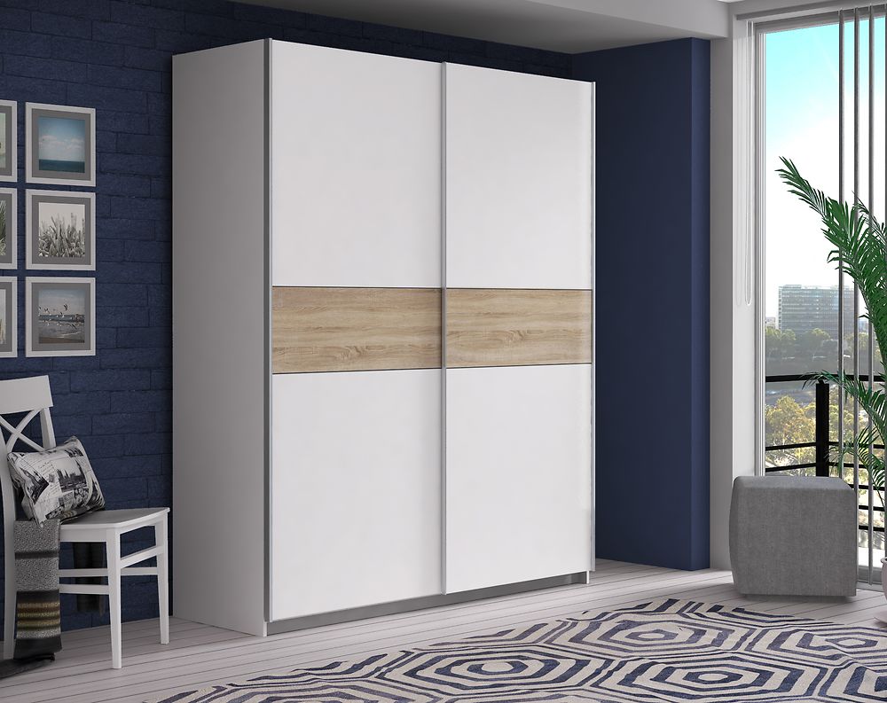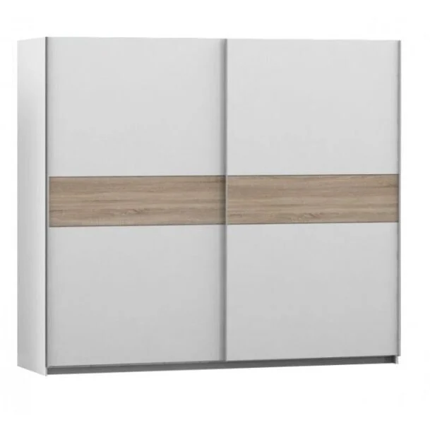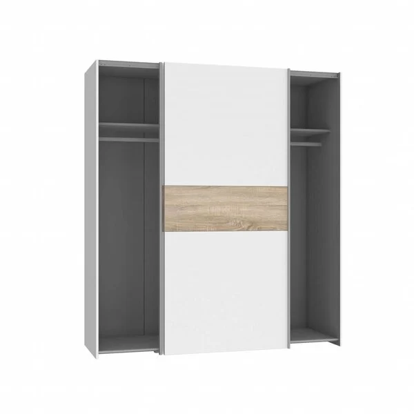 Winner-liukuovikomero tarjoaa joustavat ovivaihtoehdot: voit valita täysin valkoiset ovet moderniin ilmeeseen tai näyttävät tammiraidalliset ovet tuomaan lämpöä sisustukseen. Valkoinen runko ja harmaa sisäpuoli viimeistelevät kokonaisuuden raikkaalla ja ajattomalla tyylillä.