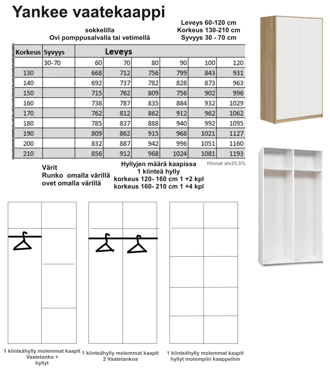Yankee on korkealaatuinen, Suomessa valmistettu kaappi, joka mukautuu täydellisesti tarpeisiisi. Valitse leveys, syvyys ja korkeus sentin tarkkuudella – halutessasi jopa millimetrin välein. Tyylikkäässä kaapissa on kaksi kaappia joissa vakiona on 1 kiinteä ja 2 säädettäväa hyllyä ja voit tilata lisähyllyjä tarpeen mukaan. Voit valita myös kaappiin tangon ja 1 kiinteän hyllyn – lisähyllyjä myös tilattavissa. Yankee kaappi toimitetaan sokkelilla