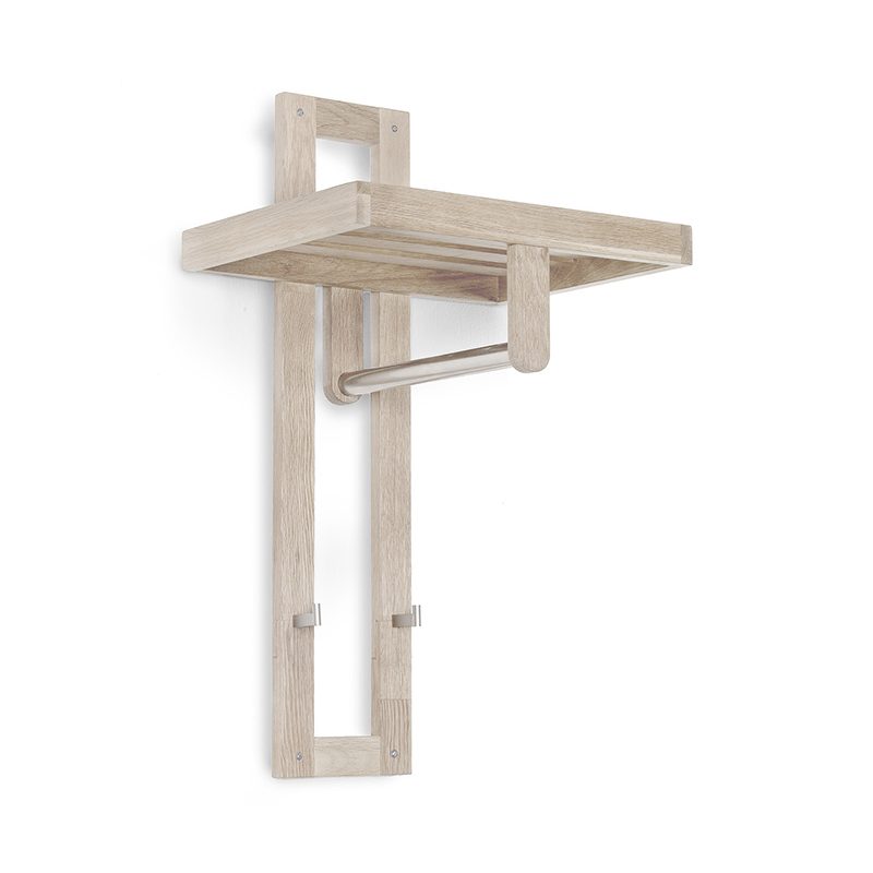 Hattuhylly on valmistettu kestävästä massiivitammesta ja viimeistelty metallisilla koukuilla sekä tangolla, jotka tuovat rakenteeseen kestävyyttä ja modernia ilmettä. Saatavana sävyissä tammi ja valkoöljytty tammi, joten se on helppo yhdistää muuhun Zitti-huonekalusarjaan ja eteisen sisustukseen.